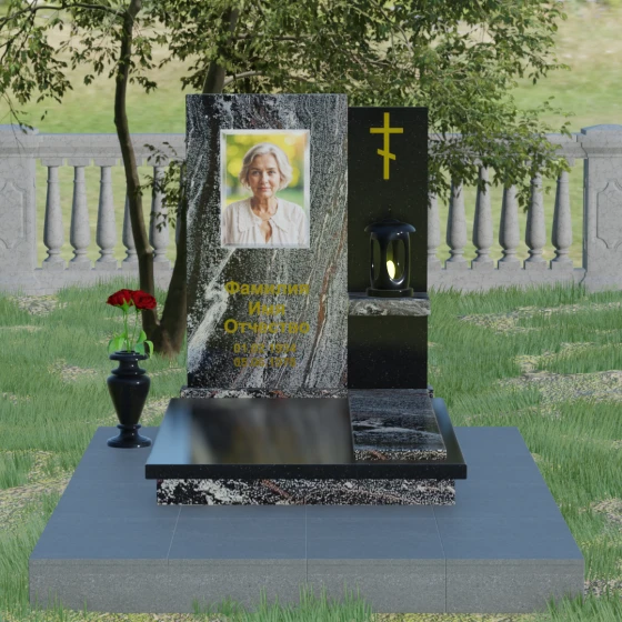 Представленная модель отличается изысканной асимметрией и сложной геометрией, где две вертикальные стелы разной высоты сливаются в единый гармоничный ансамбль. Левая часть, более высокая и массивная, имеет плавный дугообразный срез в верхней части. Этот мягкий изгиб символизирует бесконечность жизненного пути и обретенный вечный покой, смягчая строгость натурального камня. На этой панели располагается портрет и основная информация, выполненная глубокой гравировкой с золочением. Правая часть композиции, выполненная из контрастного камня, служит духовным акцентом: на ней закреплен лаконичный православный крест, сияющий золотом, что подчеркивает веру и надежду на вечную жизнь.