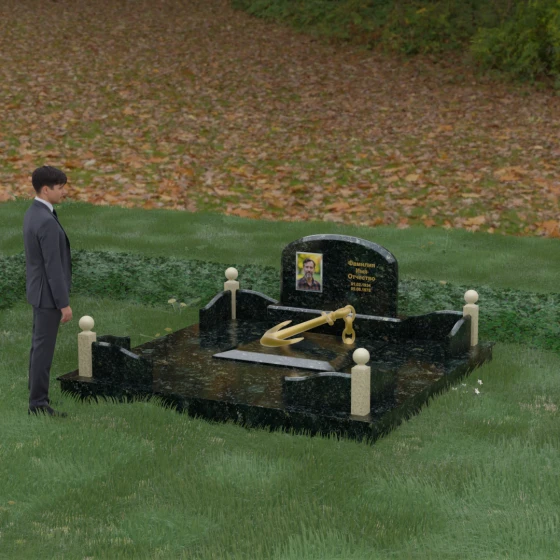 • Центральный символ: На надгробной плите расположен объемный декоративный элемент в виде золотого якоря с массивной цепью. Этот символ олицетворяет надежду, твердость характера и профессиональный путь, связанный со стихией, становясь смысловым центром всего мемориала.
