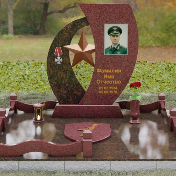 Кому подойдет: Данный мемориальный комплекс спроектирован для увековечивания памяти мужчин, чья жизнь была связана с воинским долгом, государственной службой или героическими поступками. Он станет достойным символом последнего пристанища для ветерана, кадрового офицера или человека с твердым характером. Армейская символика в сочетании с изысканным европейским стилем благоустройства (каменная ваза для живых цветов, лаконичная лампада на постаменте) подчеркивает уважение семьи к заслугам и личным качествам дорогого человека.
