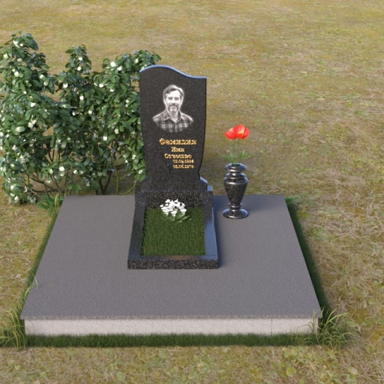 Величественная стела памятника ПВ 015 выполнена в строгой, но элегантной форме. Верхняя часть памятника имеет плавный, волнообразный силуэт, что придает ему мягкость и изящество. Сглаженные углы и отсутствие острых граней создают ощущение покоя и умиротворения. Боковые грани стелы слегка скошены, что визуально облегчает конструкцию и добавляет ей динамичности. Фаска, обрамляющая верхнюю часть памятника, подчеркивает его контур и придает завершенность образу. Нижняя часть стелы, переходящая в тумбу, имеет строгую прямоугольную форму, обеспечивая устойчивость и надежность всей конструкции. Зеркальная полировка поверхности камня отражает окружающий мир, создавая ощущение глубины и света. На стеле располагается портрет усопшего, выполненный с высокой точностью и детализацией, а также памятная надпись, нанесенная золотыми буквами.