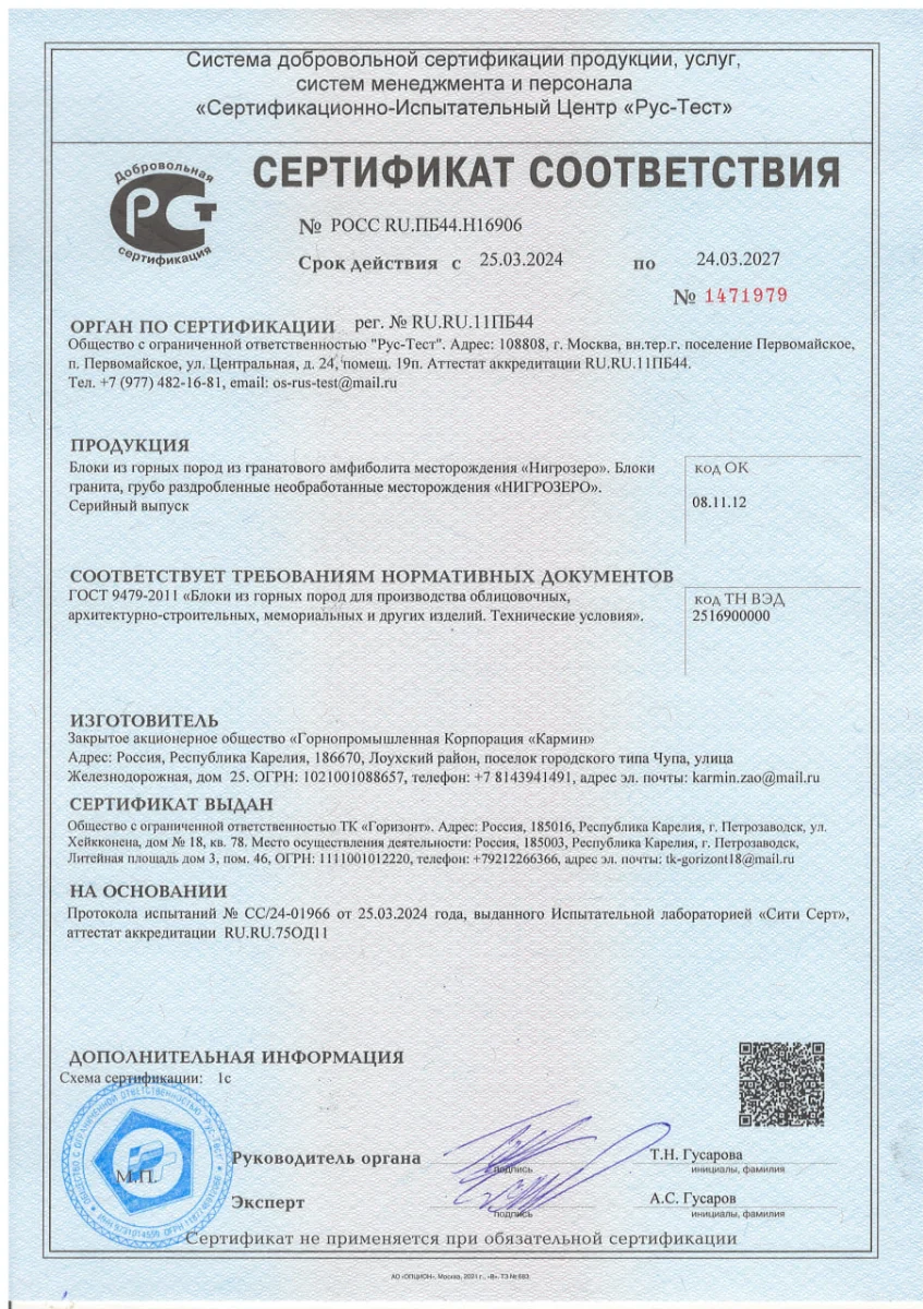 Мы хотим, чтобы вы были абсолютно уверены в качестве и безопасности материала, из которого будет изготовлен памятник для ваших близких. Поэтому мы публикуем сертификаты соответствия на основные виды гранита, которые мы используем в работе.