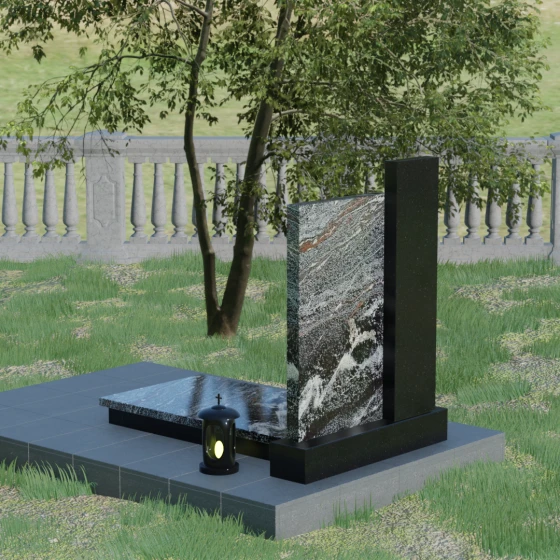 Визуальное решение данного мемориала строится на благородном контрасте двух вертикальных элементов, что позволяет создать глубокий и многогранный художественный образ. Композиция состоит из двух стел разной высоты, установленных внахлест. Более высокая и узкая стела служит духовным стержнем комплекса: на её полированной поверхности закреплен лаконичный православный крест. Его строгие линии и золотистое покрытие подчеркивают святость места и символизируют надежду на вечную жизнь. Широкая основная панель выступает в качестве смыслового центра, где располагается портрет и основные памятные надписи. Использование фотокерамики или портрета на стекле в специальной нише придает образу особую четкость и глубину, гармонируя с зеркальной поверхностью камня.