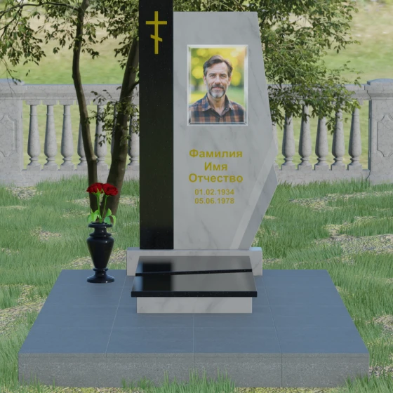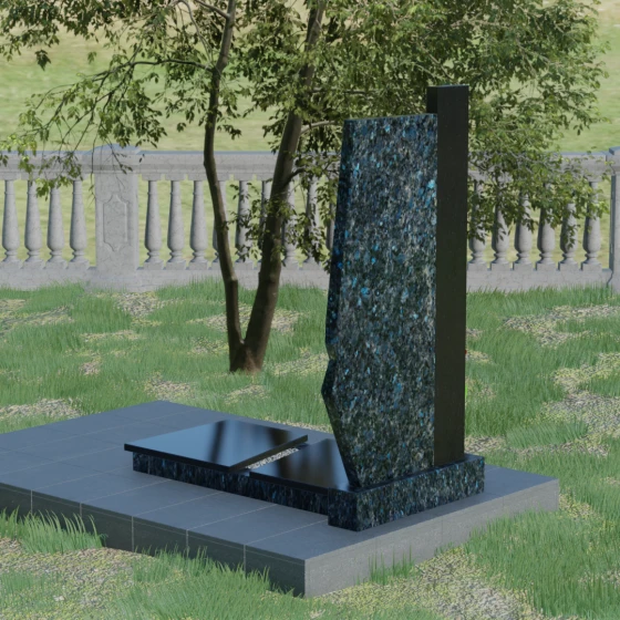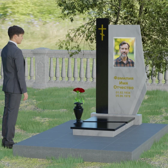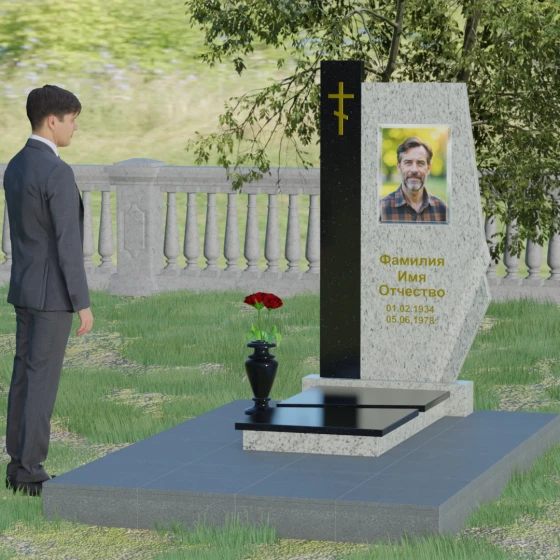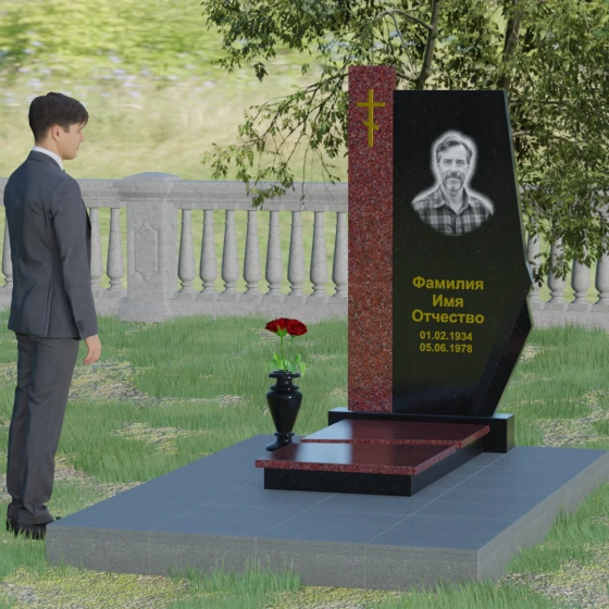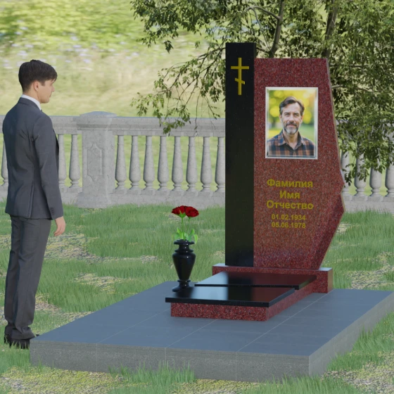 Данная мемориальная композиция — это торжество современной архитектурной мысли, воплощенное в благородном граните. Выбор этой модели обусловлен её уникальной асимметричной геометрией, которая выделяет захоронение на фоне типовых решений. Комбинированное исполнение из двух контрастных видов камня позволяет создать глубокий визуальный акцент: вертикальная колонна из насыщенного красного гранита символизирует духовную опору и жизненную энергию, в то время как основная стела из глубокого черного камня олицетворяет вечный покой и скорбь. Надгробие из натурального камня такой формы выглядит монументально и одновременно изящно благодаря сложной огранке. Правая грань основной стелы дополнена характерным скосом и ступенчатым вырезом, что придает изделию динамику и многогранность. Особое внимание уделено игре света и тени на полированных поверхностях: зеркальный блеск черного гранита отражает небо, создавая эффект глубины, а матовые фаски подчеркивают строгость и чистоту линий архитектурного ансамбля.