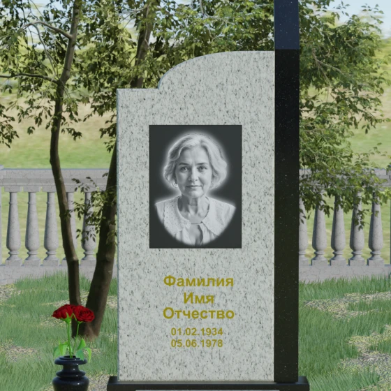 Данная мемориальная композиция представляет собой образец современного архитектурного искусства, где строгая геометрия встречается с мягкой природной грацией. Дизайн изделия построен на эстетике асимметрии: левый край стелы выполнен в виде четкого, волевого «шага», который мгновенно переходит в плавную, нисходящую дугу с правой стороны. Такая форма символизирует баланс между земной твердостью и бесконечным небесным покоем. Вертикальная стела дополнена узким акцентным столпом из контрастного камня, который создает мощную вертикаль, визуально устремляя всю конструкцию ввысь. Тщательно выверенные пропорции позволяют этому монументу органично вписаться в ландшафт любого мемориального комплекса, выделяясь своей лаконичностью и благородством линий.