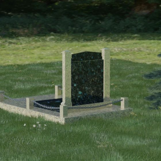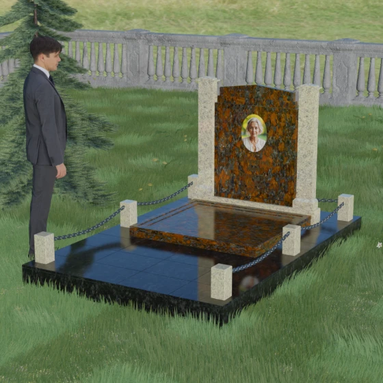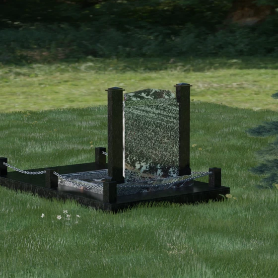 Особого внимания заслуживает полное благоустройство участка, входящее в концепцию модели 011. Памятник устанавливается на массивный гранитный цоколь, который придает всей конструкции устойчивость и защищает её от сезонных подвижек грунта. Вместо открытого цветника здесь используется сплошная надгробная плита, закрывающая всю площадь захоронения. Это создает эстетически законченный, строгий вид и значительно упрощает уход за могилой — вам не придется бороться с сорняками или обновлять засыпку. Завершают композицию аккуратные каменные столбики с декоративными цепями, которые обозначают границы частного пространства, создавая атмосферу уединения и покоя.