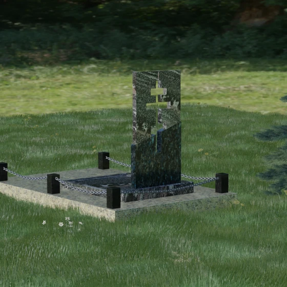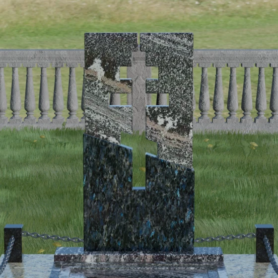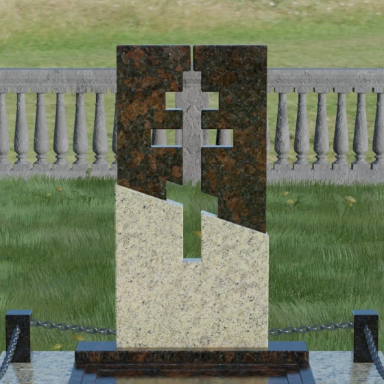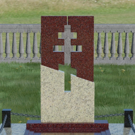 Данная модель — это торжество современной архитектуры и глубокого сакрального смысла. В центре композиции находится величественная стела, состоящая из двух контрастных блоков, разделенных динамичной диагональной линией. Этот художественный прием символизирует границу между земным и вечным, светом и тенью. Главной особенностью изделия является филигранная сквозная резьба: в самом сердце камня вырезан православный восьмиконечный крест. Лаконичность форм подчеркивает строгость и достоинство, а отсутствие лишнего декора позволяет сфокусироваться на главном символе веры.