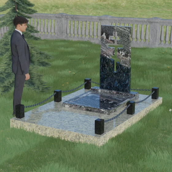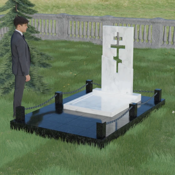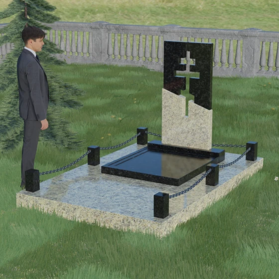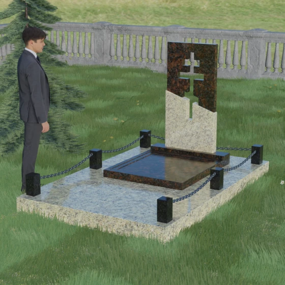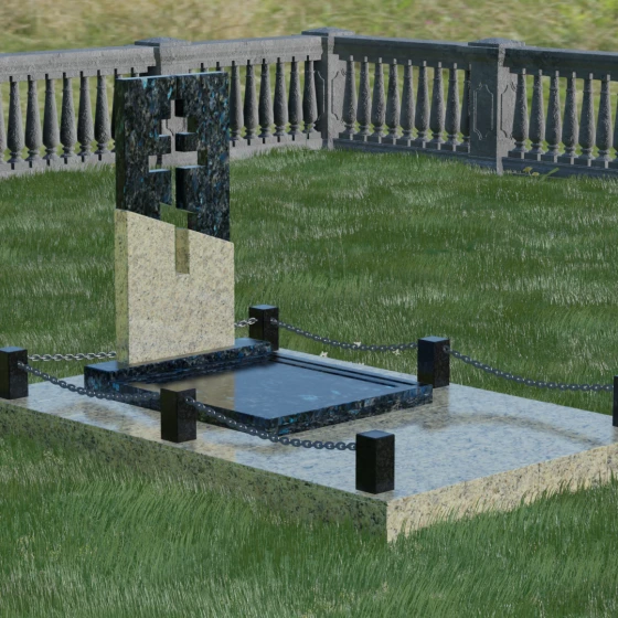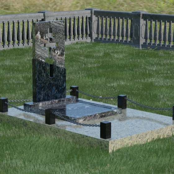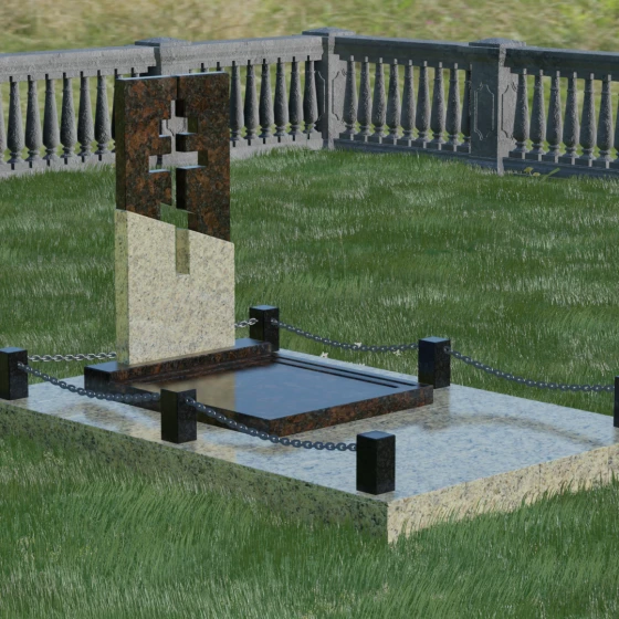 Особое внимание уделено комплексному благоустройству места захоронения. Скульптурная композиция установлена на массивный гранитный цоколь, который служит надежным фундаментом. Участок полностью закрыт сплошной надгробной плитой, выполненной в единой цветовой гамме со стелой. Такое решение не только придает мемориалу завершенный, монументальный вид, но и значительно упрощает уход за местом памяти: вам не придется бороться с сорняками или обновлять грунт. Периметр участка обозначен строгими каменными столбиками, соединенными декоративными цепями, что создает атмосферу защищенности и уединения, отделяя священное место от остального мира.