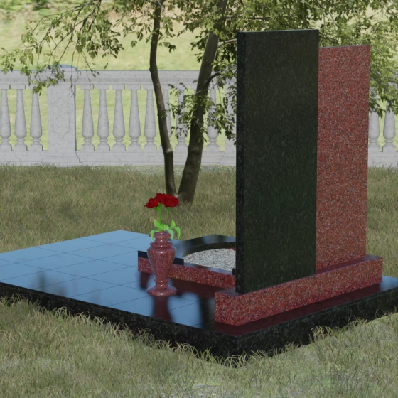 Благоустройство участка в данной модели выполнено по европейскому стандарту. Весь ансамбль установлен на массивный гранитный цоколь, который служит надежным фундаментом и защищает конструкцию от перекосов почвы. Вместо традиционного открытого цветника здесь используется закрытая надгробная плита оригинальной формы. Её верхний элемент выполнен в виде изящной светлой арки, которая эффектно возвышается над темным основанием, создавая многоуровневость. Такое решение не только придает мемориалу законченный, аккуратный вид, но и значительно упрощает уход за местом захоронения. Завершает композицию изящная каменная ваза, интегрированная в общую стилистику, что позволяет всегда поддерживать эстетику участка, украшая его цветами в знак вечной любви.