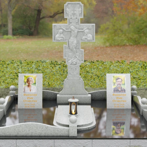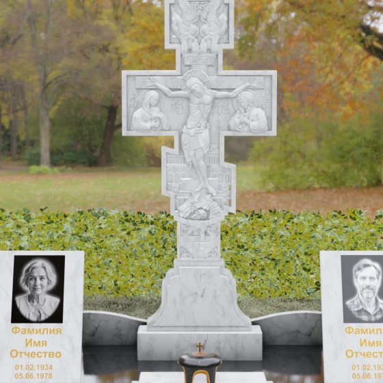 Данный мемориальный ансамбль представляет собой совершенный баланс между духовными традициями и современной архитектурной эстетикой. В центре композиции находится величественная стела в форме высокого православного креста, украшенного детальной многоуровневой резьбой. Барельефное изображение Распятия, выполненное с глубокой проработкой каждой детали — от складок плащаницы до ликов предстоящих, — создает ощущение покоя и благодати. Светлая, матовая фактура резного камня эффектно контрастирует с зеркально отполированными боковыми элементами, предназначенными для увековечивания памяти близких.