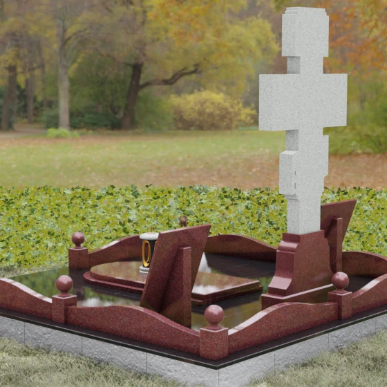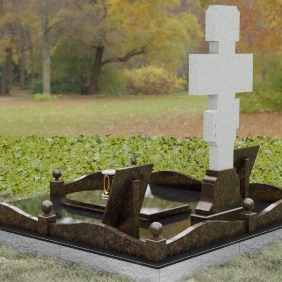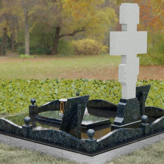Особое внимание в этой модели уделено геометрии и пластике линий. Плавные изгибы цоколя и волнообразные формы боковых стел символизируют бесконечность жизненного пути и тихую гавань вечного упокоения. Эти мягкие переходы лишают монумент излишней суровости, превращая его в изысканный мемориальный объект, который гармонично вписывается в ландшафт, создавая атмосферу умиротворения и высокого стиля.