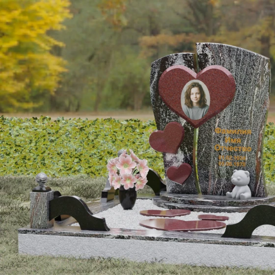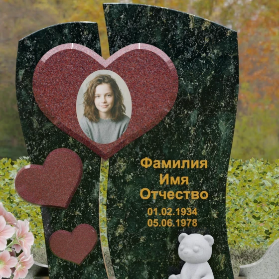Этот величественный гранитный монумент представляет собой высокохудожественное произведение, в котором каждая линия наполнена глубоким смыслом. Композиция обелиска построена на волнующем контрасте разделения и единения. Массивная вертикальная плита словно рассечена плавной, изогнутой линией на две неравные части, символизируя разлом, произошедший в жизни. Однако эти части не распадаются — их крепко и неразрывно соединяет главное связующее звено: крупное, объемное сердце. Этот центральный элемент, выполненный в контрастном цвете (например, насыщенно-красном на фоне строгого черного или глубокого зеленого камня), служит идеальным обрамлением для портрета, акцентируя внимание на светлом образе ушедшего человека. Слева, вдоль изгиба, каскадом расположены еще три сердца меньшего размера, создавая ритмичный визуальный ряд, подобный биению любящей души. Вся поверхность камня, включая сложные криволинейные резы, отполирована до идеального зеркального блеска, придавая конструкции торжественность и монументальность.