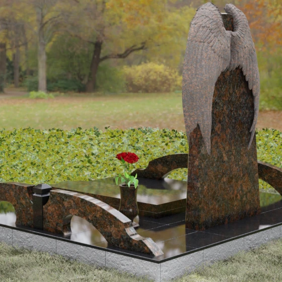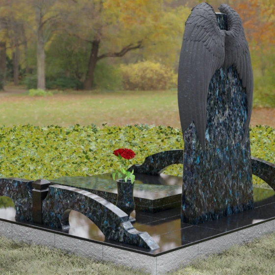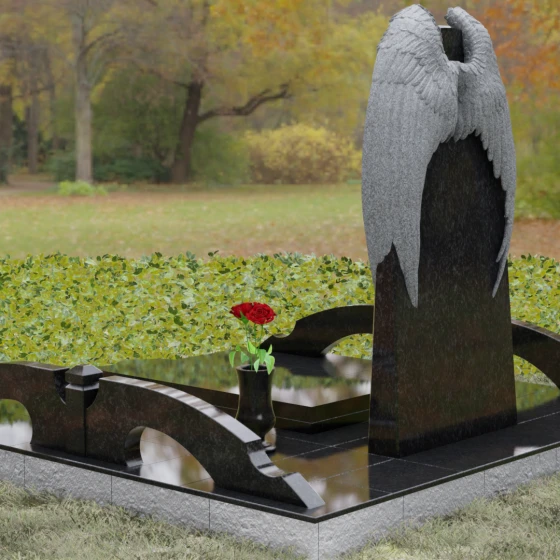 Данное ритуальное изделие (артикул 161) представляет собой подлинное воплощение тихой скорби и небесного покровительства. В центре художественной композиции находится вертикальная стела, которую бережно, словно в последнем земном объятии, обрамляют два резных ангельских крыла. Плавность изгибов этих элементов символизирует чистоту души и бесконечный жизненный путь, переходящий в вечный покой. Мастера уделили особое внимание детализации: каждое перышко на крыльях проработано с ювелирной точностью, создавая глубокий рельеф и объем, который эффектно контрастирует с идеально гладкой, зеркальной поверхностью основной части камня.