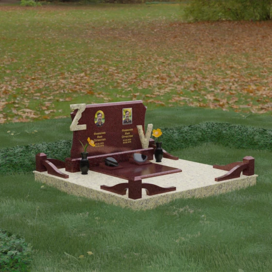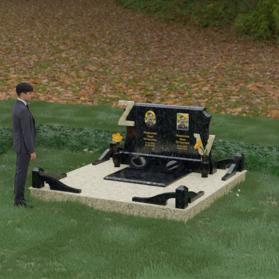 Центральным элементом изделия является массивная горизонтальная стела, обладающая сложной многоуровневой геометрией. Верхняя грань плиты украшена изящными симметричными вырезами, которые смягчают строгость прямоугольных форм и придают конструкции завершенный, эстетически выверенный вид. Особое внимание привлекает игра контрастов: глубокая зеркальная полировка основного массива камня эффектно подчеркивается светлыми вставками. Рельефные буквы Z и V, выполненные из контрастного гранита, выступают над поверхностью, создавая впечатляющий эффект объема и наделяя монумент уникальным характером.