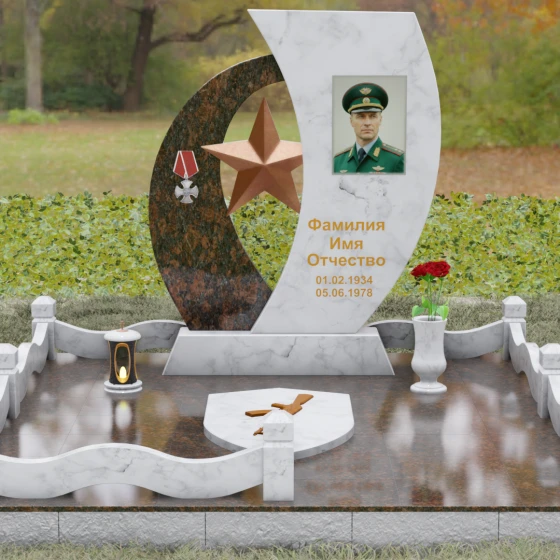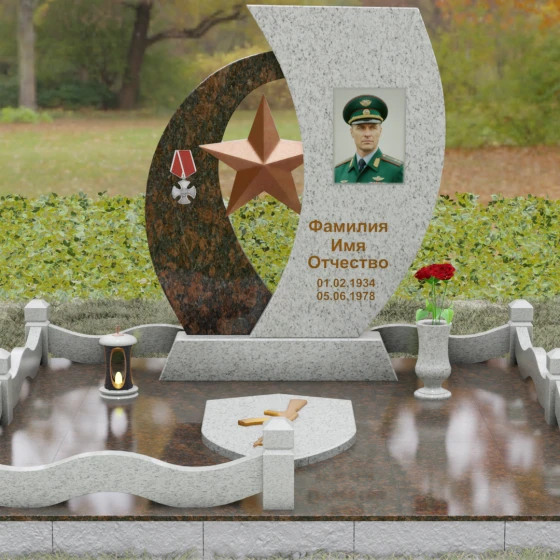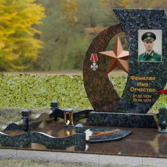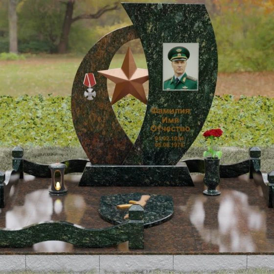 Кому подойдет: Данный мемориальный комплекс спроектирован для увековечивания памяти мужчин, чья жизнь была связана с воинским долгом, государственной службой или героическими поступками. Он станет достойным символом последнего пристанища для ветерана, кадрового офицера или человека с твердым характером. Армейская символика в сочетании с изысканным европейским стилем благоустройства (каменная ваза для живых цветов, лаконичная лампада на постаменте) подчеркивает уважение семьи к заслугам и личным качествам дорогого человека.