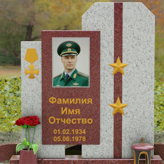 Выбор мемориального комплекса — это всегда поиск баланса между строгостью формы и глубиной чувств. Модель Артикул 201 представляет собой сложную архитектурную композицию, которая идеально подходит для увековечивания памяти сильного, волевого человека, посвятившего жизнь служению. Надгробие из натурального камня состоит из трех вертикальных элементов, создающих динамичный, ступенчатый силуэт. Центральная стела, предназначенная для размещения портрета и основной информации, обрамлена боковыми пилонами из контрастного красного гранита. Такая геометрия символизирует устойчивость, надежную опору и непоколебимость духа. Сочетание строгих прямых линий и аккуратных фасок на вершинах придает памятнику торжественный, парадный вид, подчеркивая заслуги и особый статус усопшего.