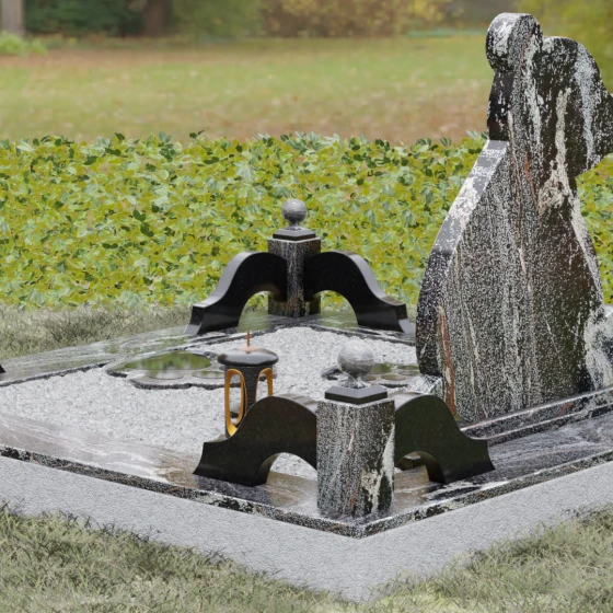 Особое внимание уделено благоустройству прилегающей территории, которое превращает памятник в завершенный мемориальный комплекс. Участок обрамлен художественным цоколем сложной геометрии. Светлые гранитные элементы ограждения имеют волнообразный изгиб, который перекликается с мягкими линиями основной стелы. Углы участка акцентированы массивными темными столбиками, увенчанными идеально отполированными каменными шарами. На надгробной плите, полностью закрывающей грунт, установлены дополнительные аксессуары: изящная гранитная ваза для живых цветов и закрытая каменная лампада, навершие которой украшено лаконичным православным крестом. Такое решение не только эстетично, но и максимально практично в вопросах ухода за местом захоронения.