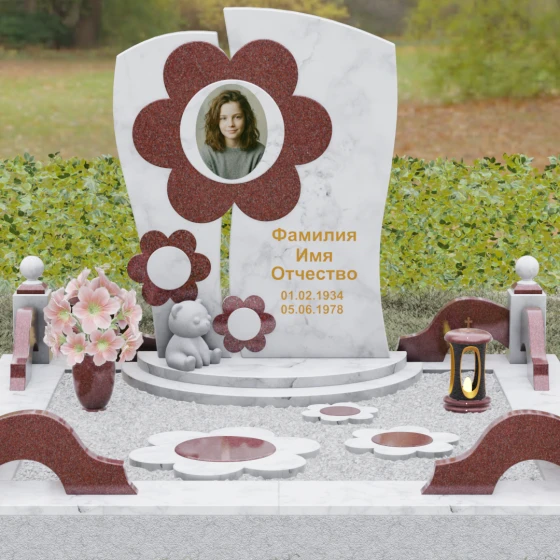Представленный мемориальный ансамбль (Артикул 241) — это не просто памятник, а подлинное художественное произведение, в котором застыла нежность и вечная весна. В центре композиции находится величественная стела, выполненная в уникальной комбинированной технике. Ее асимметричная форма с деликатным вертикальным разделением создает динамичный и в то же время гармоничный силуэт. Главным акцентом является искусно вырезанный из камня цветок, в сердцевину которого помещен портрет. Плавные, округлые лепестки символизируют чистоту и хрупкость жизни, а их объемная фактура создает удивительную игру света и тени, контрастируя с глубокой зеркальной полировкой основного полотна стелы.