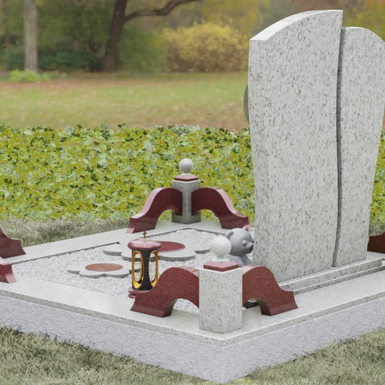 Мастерство камнереза здесь проявляется в каждой детали: от точно выверенных изгибов основной плиты до малых декоративных цветов у подножия, которые словно «прорастают» сквозь твердый гранит. Благоустройство участка выполнено в едином стилистическом ключе, создавая законченный и торжественный вид. Основание памятника опирается на сложный многоуровневый цоколь. Массивный каменный бордюр с плавными волнообразными линиями обрамляет место захоронения, обеспечивая эстетическую чистоту и легкость в уходе. Углы композиции акцентированы изящными столбиками с навершиями в виде полированных шаров, а установленная каменная лампада и скульптурная фигурка медвежонка добавляют мемориалу особую душевную теплоту и индивидуальность.