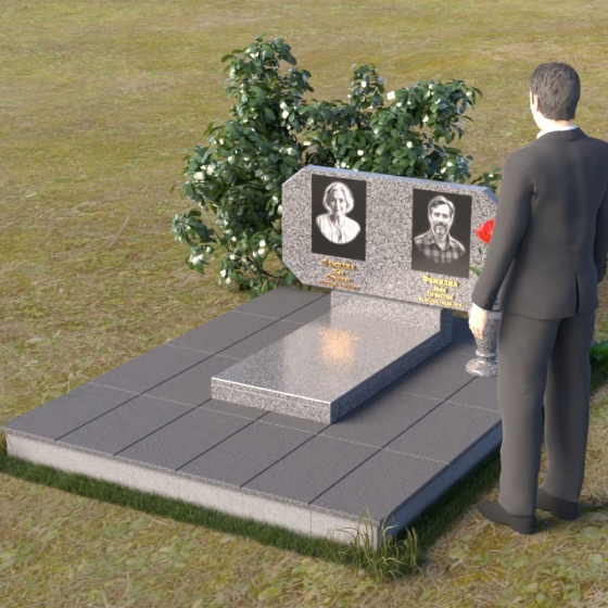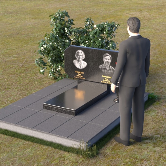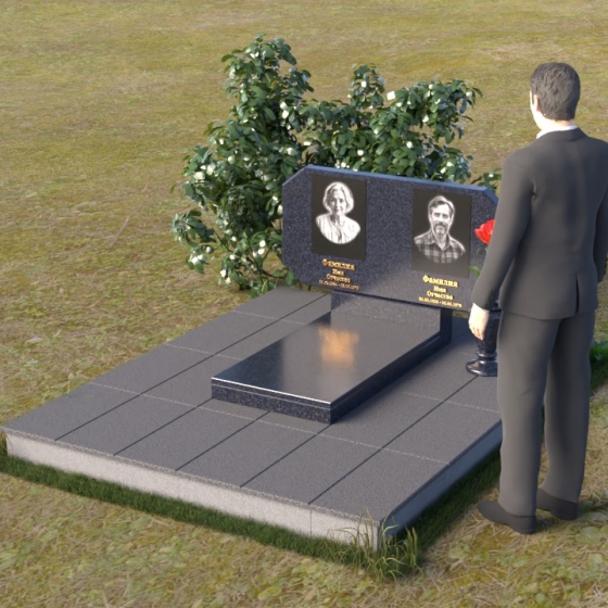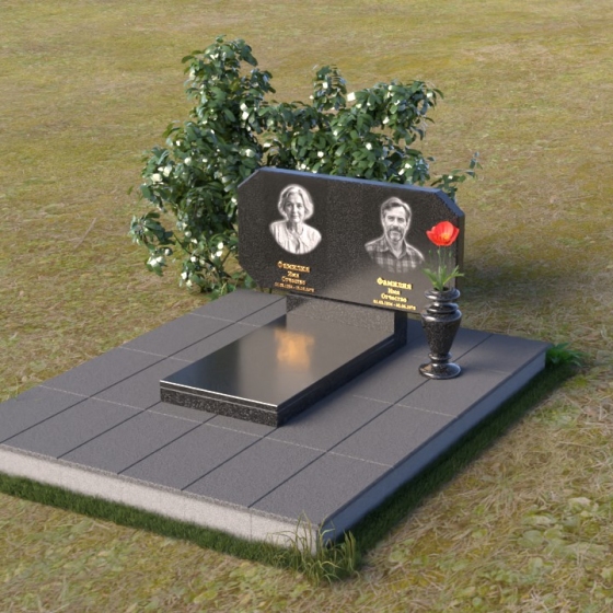 Композиция памятника строится на контрасте строгих геометрических форм и плавных линий, символизирующих жизненный путь и обретение покоя. Стела имеет форму, близкую к прямоугольнику, но с элегантно скошенными углами, смягчающими ее строгость. Верхняя часть стелы имеет две небольшие грани, словно фацеты драгоценного камня, добавляющие ей изысканности. Поверхность камня отполирована до зеркального блеска, что подчеркивает глубину черного цвета и создает ощущение торжественности. На лицевой стороне размещены портреты усопших, выполненные с высокой степенью детализации. Ниже портретов выгравированы надписи, выполненные строгим шрифтом. Справа от стелы установлена небольшая ваза, выполненная в том же стиле, что и памятник, и украшенная простым, но элегантным орнаментом.