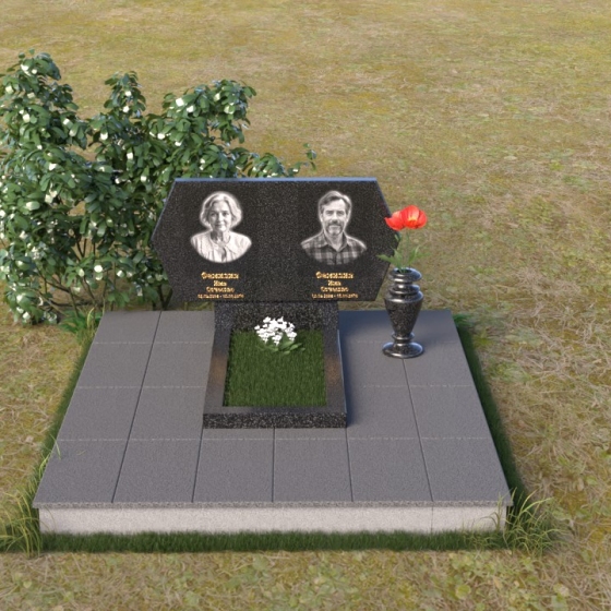 Величественная стела памятника ПГ004 представляет собой элегантное сочетание строгих линий и мягких, сглаженных углов. Верхняя часть имеет форму, близкую к прямоугольнику, но с деликатно скошенными верхними углами, что придает ей визуальную легкость и утонченность. Боковые грани плавно переходят в лицевую поверхность, создавая ощущение обтекаемости и завершенности. Фаска по периметру лицевой стороны подчеркивает четкость контура и добавляет дополнительный объем. Нижняя часть стелы, служащая основанием для размещения информации и портретов, выполнена в форме прямоугольной призмы, гармонично сочетающейся с основной частью памятника. Подставка под вазу выполнена в классическом стиле и имеет плавные обтекаемые формы.
