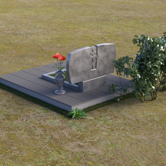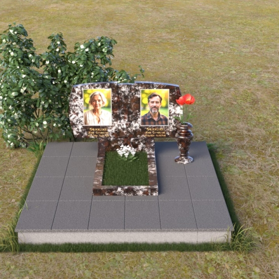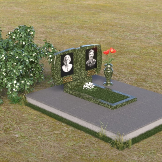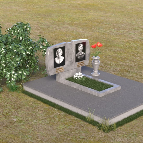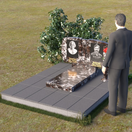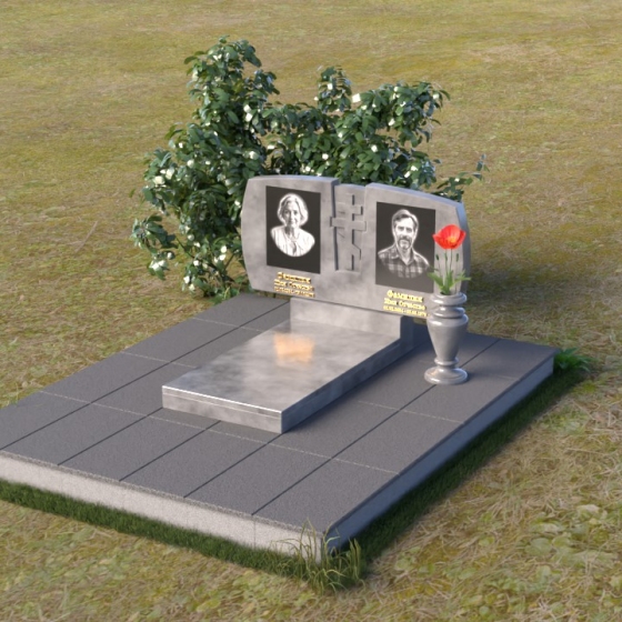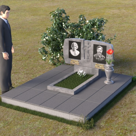 Геометрия модели тщательно продумана. Верхняя часть стел имеет скругленные углы, смягчающие строгость линий и придающие композиции более человечный облик. Между портретами выгравирован лаконичный православный крест, напоминающий о духовности и вере. Основание стел переходит в горизонтальную плиту, образуя единую плоскость с надгробной плитой. Надгробная плита выполнена в виде прямоугольника с полированной поверхностью, отражающей небо и окружающий мир. У основания композиции располагается аккуратная ваза из черного гранита, предназначенная для живых цветов, как символ непреходящей любви и уважения.