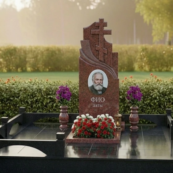 Центральным элементом композиции является массивная стела, выполненная в строгой, но в то же время выразительной форме. Её верхняя часть представляет собой величественное сочетание двух православных крестов, один из которых возвышается над другим, создавая ощущение духовной защиты и вознесения. Кресты отличаются лаконичностью и четкостью линий, без излишних деталей, что подчеркивает их сакральное значение. Справа от вертикального креста, плавно переходя в его основание, вырезан изящный горизонтальный элемент, напоминающий стилизованную драпировку или развевающееся знамя, которое придает монументу динамику и глубину. Левая грань стелы имеет строгую прямолинейную форму, подчеркивая монументальность, в то время как правая грань изящно изогнута, создавая плавную волну, которая смягчает общий облик и добавляет ему художественной выразительности. Все грани стелы тщательно отполированы до зеркального блеска, что позволяет камню играть на свету, отражая окружающий мир и создавая глубокие блики. Контраст полированной поверхности с матовыми, слегка шероховатыми срезами на резных элементах крестов и драпировки, создает удивительную игру фактур, подчеркивая мастерство обработки камня.