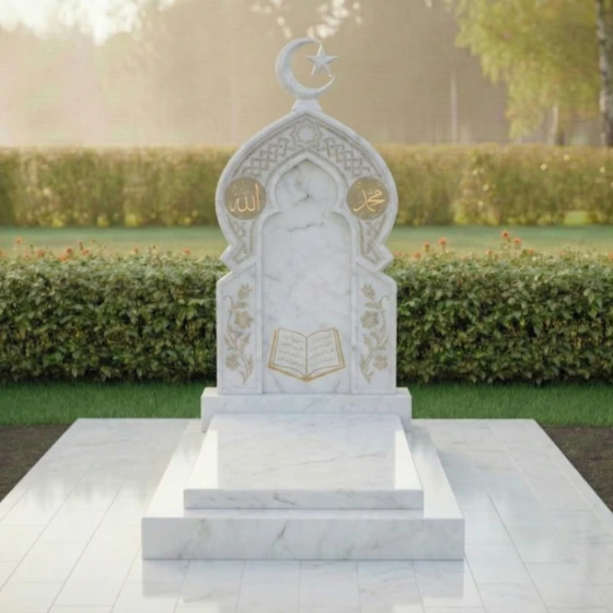 Ритуальное изделие артикула ПН 510 представляет собой глубокое художественное осмысление вечности и памяти, воплощенное в камне. Это не просто надгробие, а целая архитектурная форма, призванная стать молчаливым свидетельством уважения и любви. Центральная стела, выполненная в глубоком черном цвете, символизирует безмятежность и покой, а ее очертания напоминают величественный вход в священное пространство. Верхняя часть стелы увенчана исламским полумесяцем со звездой, выполненным из светлого камня, что создает выразительный контраст и придает композиции духовную значимость.